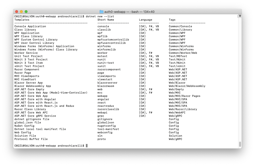 cd templates-playground/templates/auth0-webapp dotnet new -u <absolute_path_of_templates-playground/templates/auth0-webapp> dotnet new -i . Once you install your template, check its available parameters by running the following command: